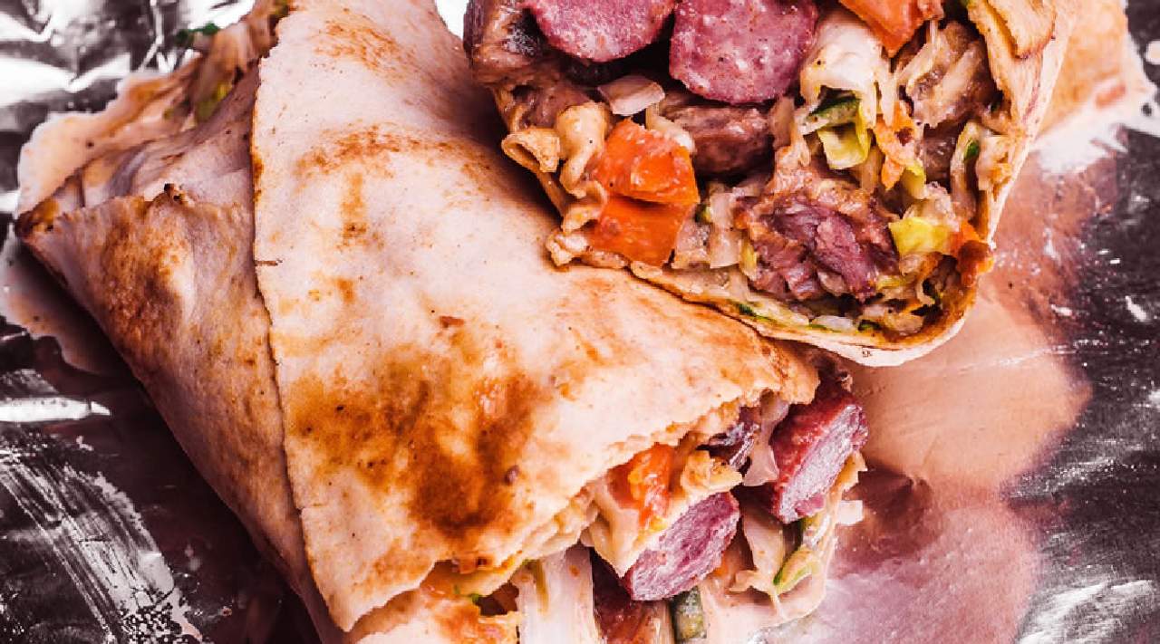 Delicious beef shawarma wrap, available with or without one hotdog