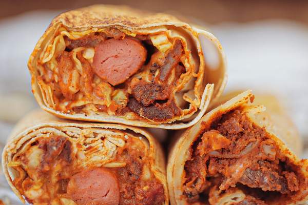 A wrap of shawarma with a combo of asun, chicken, 2 sausages and cheese