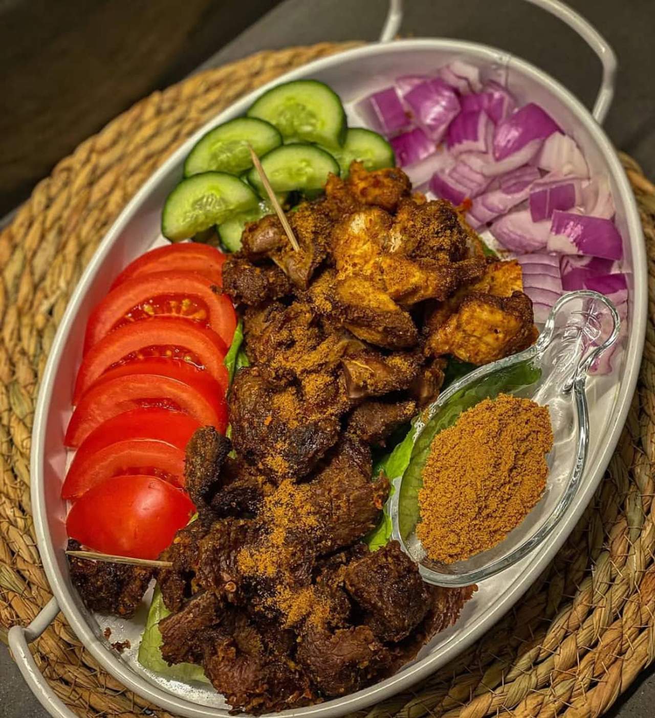 Tender, spicy roasted ram meat skewers, seasoned with rich suya spices for a flavorful bite