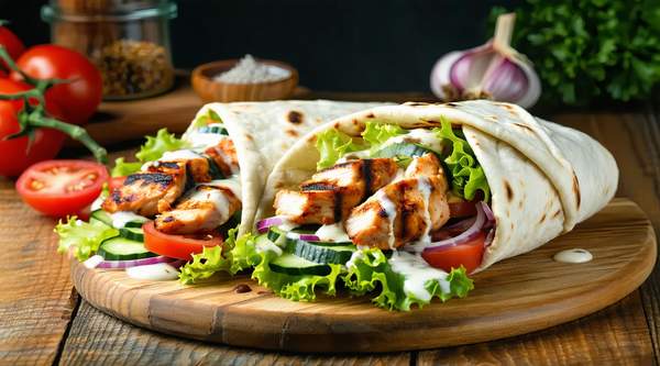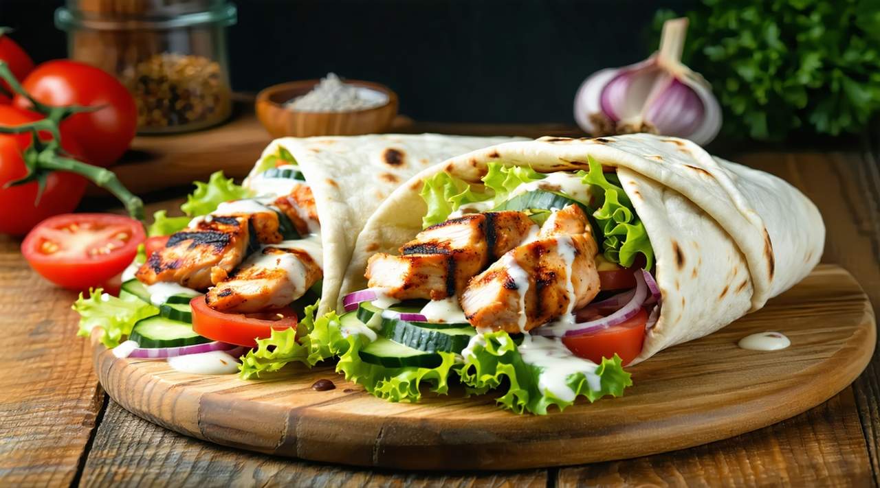 Grilled chicken wrapped with veggies and sauces in pita bread