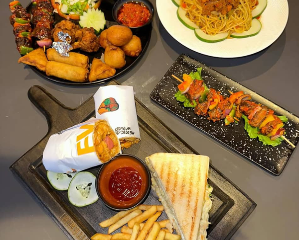 Chicken wings, peppered cowtail, goat meat, chicken nugget, spring roll, butterfly prawn, snail, plantain/yam chips