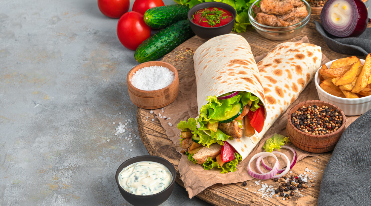 tortilla, mięso mieszane wołowina / kurczak, ser, sos, pasta czosnkowa