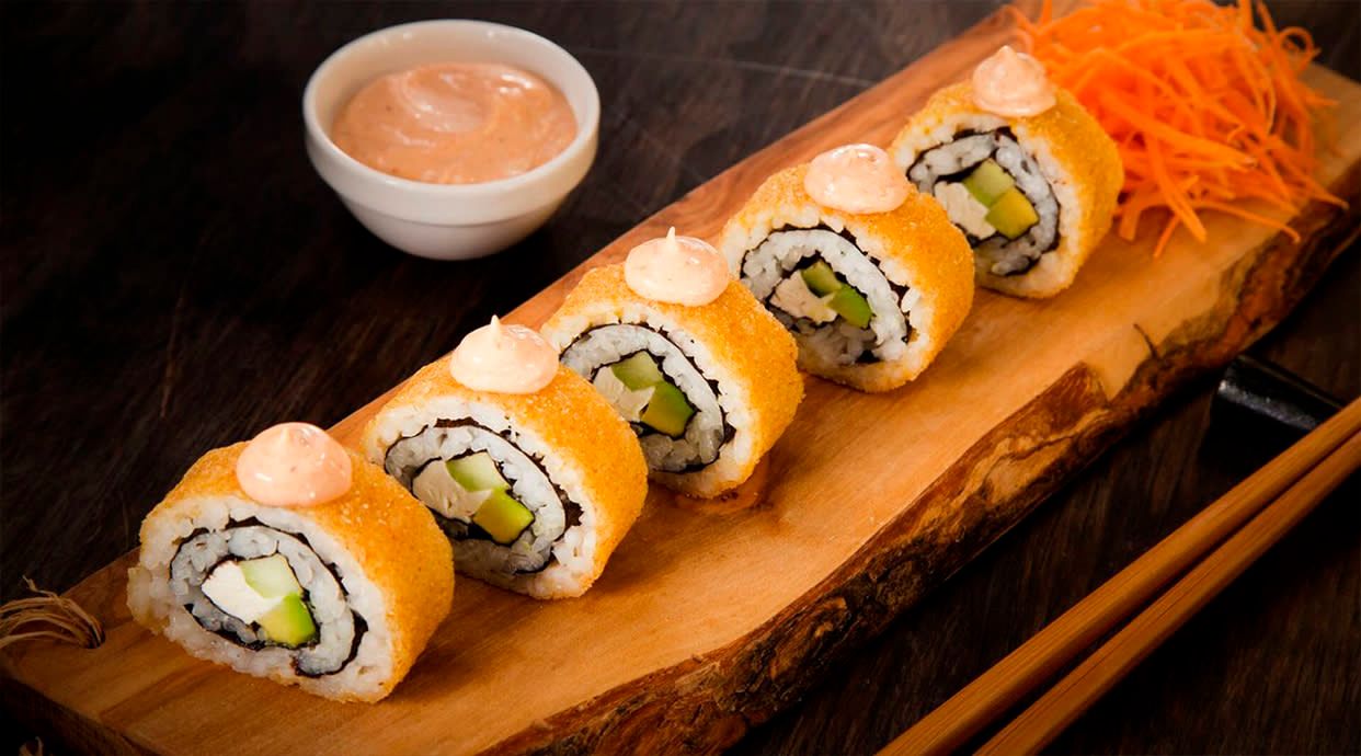 ryż, pieczony łosoś, serek, tykwa, ogórek - całość owinięta nori, smażona w panko