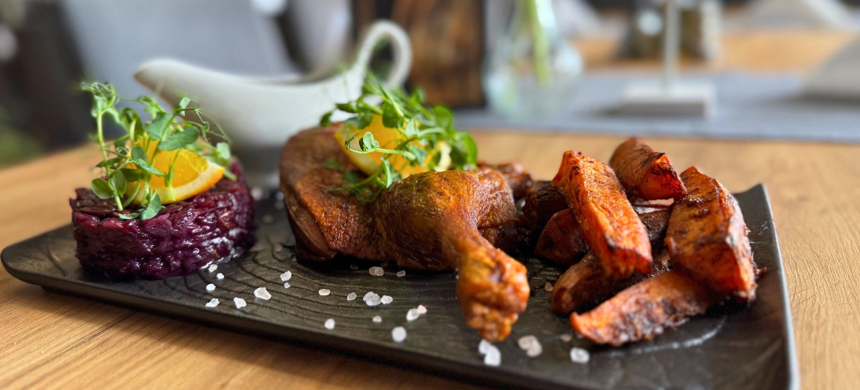 Pieczona kaczka, pieczone bataty z ziołami, czerwona kapusta duszona na czerwonym winie