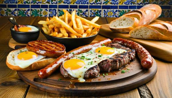 Bife, queijo, fiambre, chouriça, paio, batata com molho especial