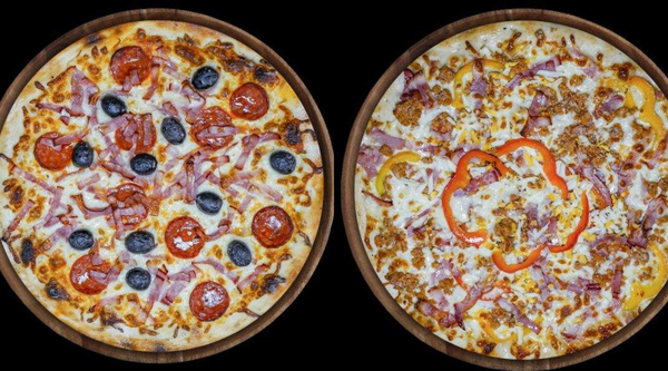 Molho de tomate com orégãos, mozzarella, fiambre, pimentos, carne, bacon e ovo. Não são adicionados orégãos na finalização.