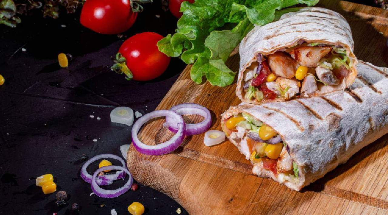 Um delicioso wrap recheado com carnes grelhadas (frango, vaca ou misto), salada fresca e molho.