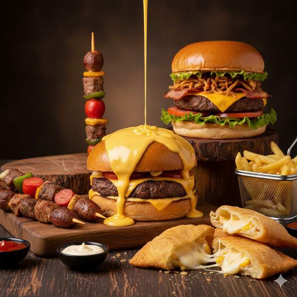 Carne bovina, pão de brioche, queijo tipo cheddar mergulhado em uma piscina de cheddar