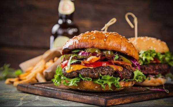 Pão, maionese, ketchup, alface, tomate, queijo cheddar de carne mista e bacon.