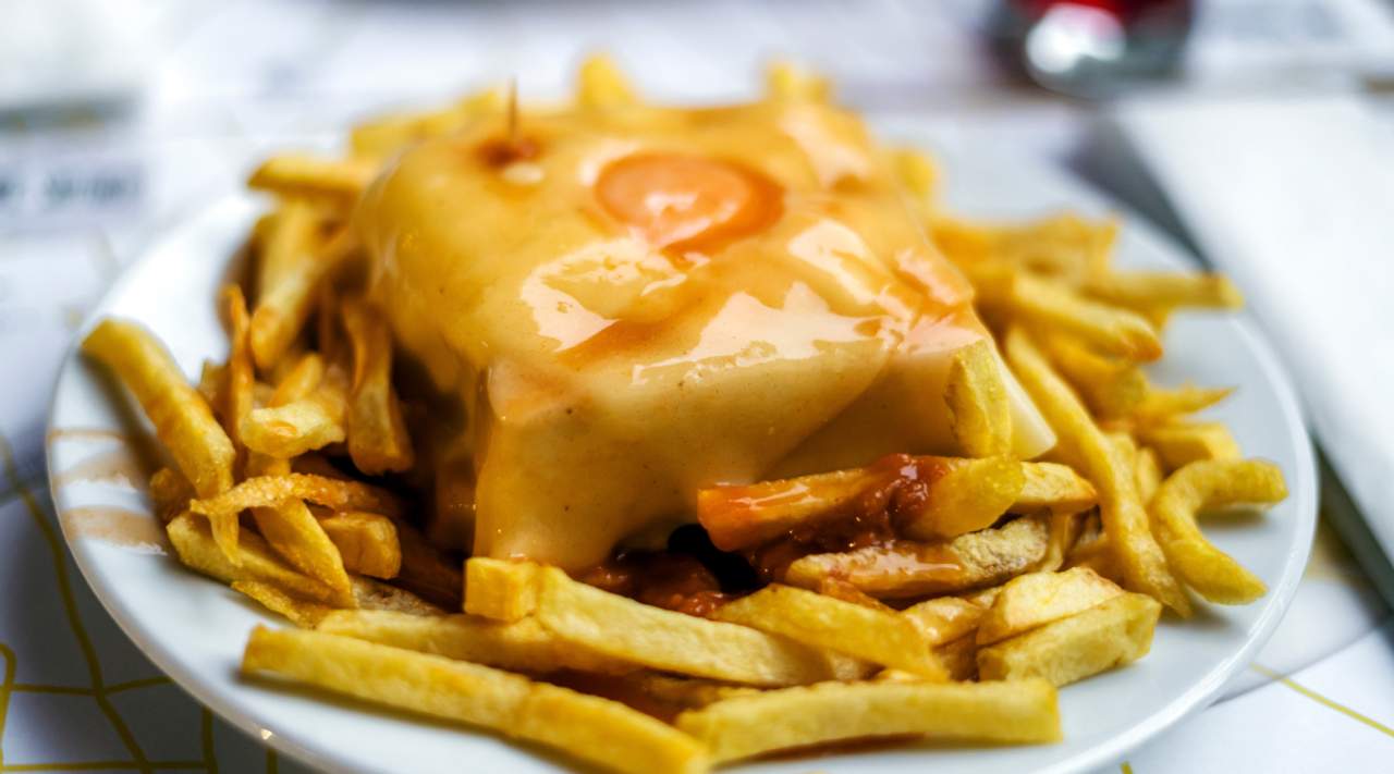 Pão, queijo, fiambre, hambúrguer (vaca), cebola frita, molho de francesinha.
