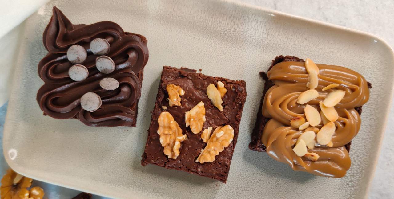 Quadrado de Brownie de Chocolate 70% com cobertura de Brigadeiro de Chocolate 70% Sem glúten, sem lactose e sem açúcar refinado.
