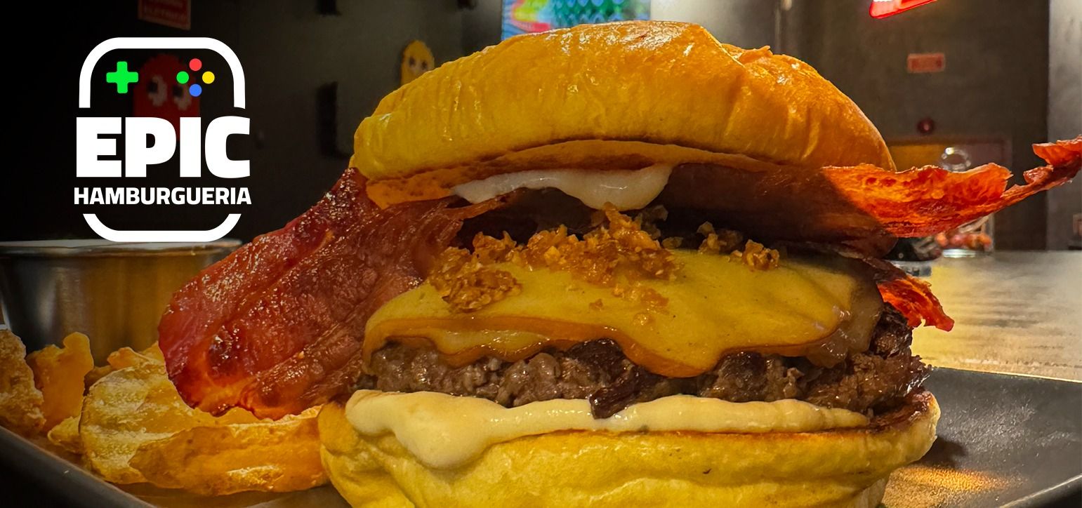 Hambúrguer de 160g com duplo queijo cheddar, cebola roxa, picles de pepino, alface fresca, pão brioche e nosso molho épico! Prepare-se para um fatality de sabor!