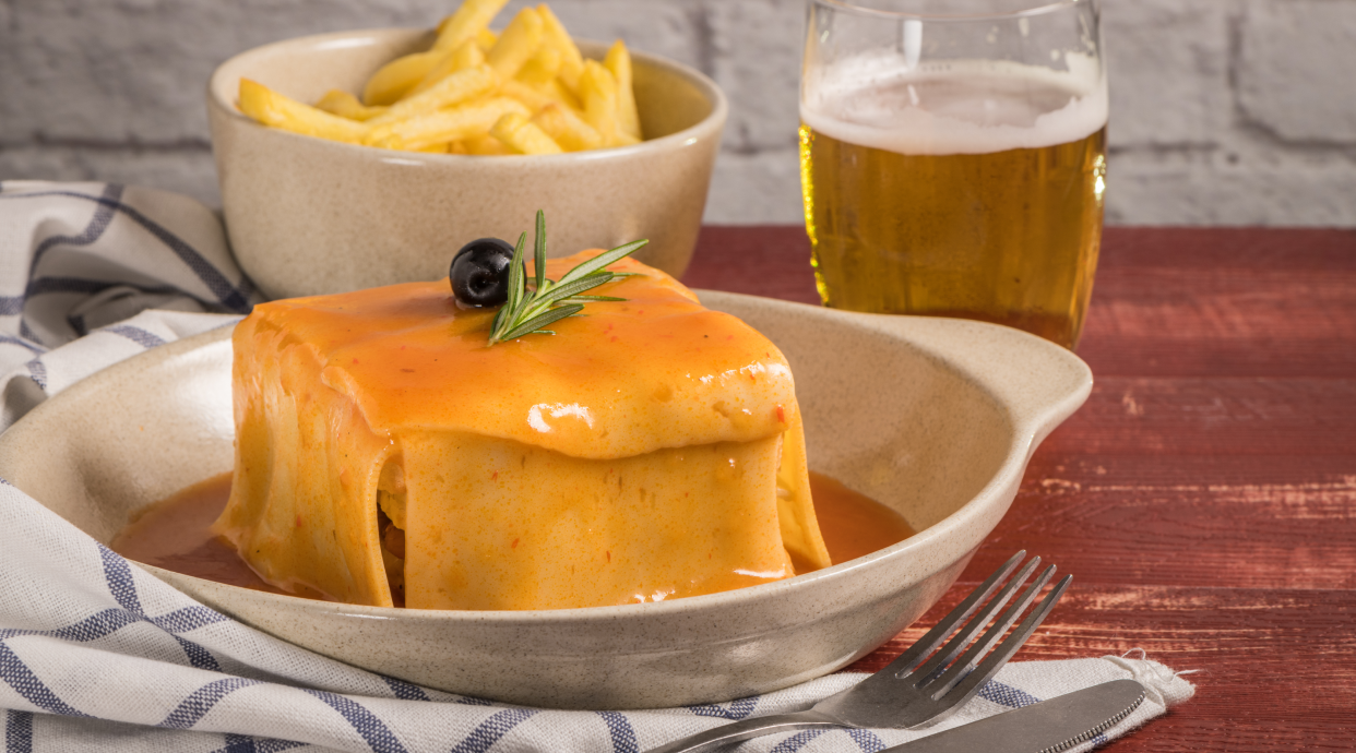 Frango, queijo, fiambre frango, chourição, ovo e molho especial