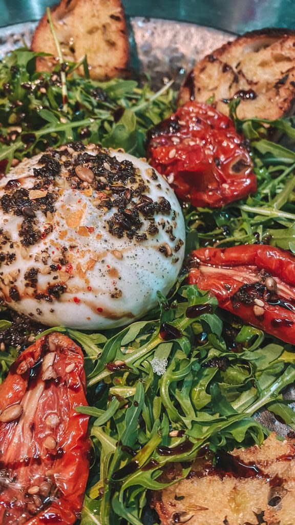 Burrata com tomates semi-secos e rúcula, temperada com creme de trufa nera, acompanhada de tostinhas de azeite e alho