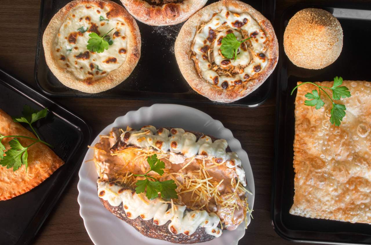 Pizza fechada e frita, molho de tomate e recheio com carne picada e queijo mozzarella e finalizada com orégão