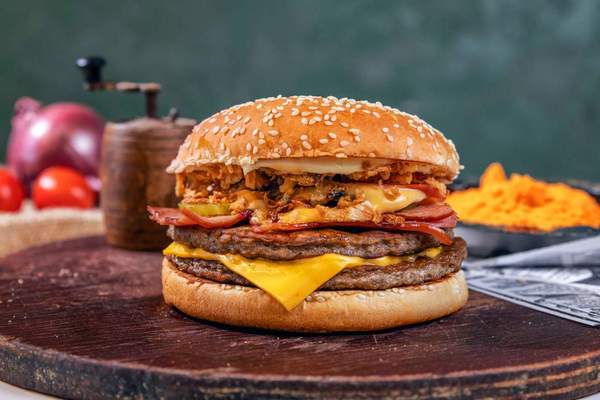Chifla cu susan, carne de vita, branza cheddar, bacon, castraveti murati, ceapa prajita, sos burger, rosii, maioneza - 352g
