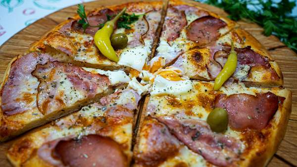 Pelat, kačkavalj, pečurke, šunka, jaje, feferoni, masline, origano