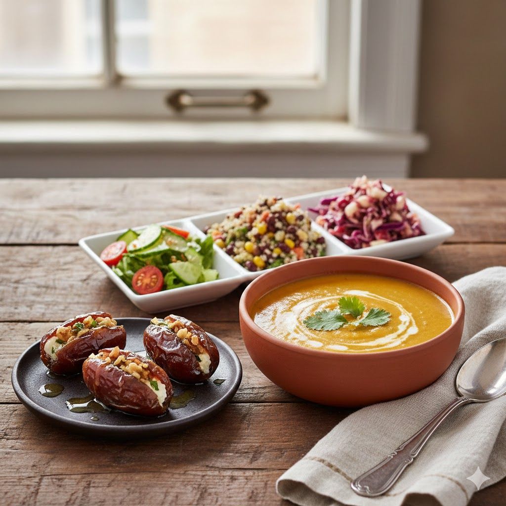 Entrées: Dattes farcie à l'oriantale , soupe du jour, Trio de salades ,Brik ou Tajine Plat: Volaille ou viande ou Poisson Dessert: fruits de saison et gàteaux