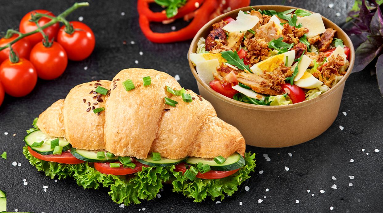 Круасан, помідор, огірок, Салямі, яєчня, сир Тостовий, листя салату, соус Цезар