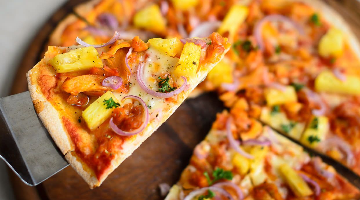 телятина, рване м'ясо зі свинячих реберець гриль, моцарелла, ананас, салат айсберг, соус теріякі, соус кімчі, перець гострий стрючковий