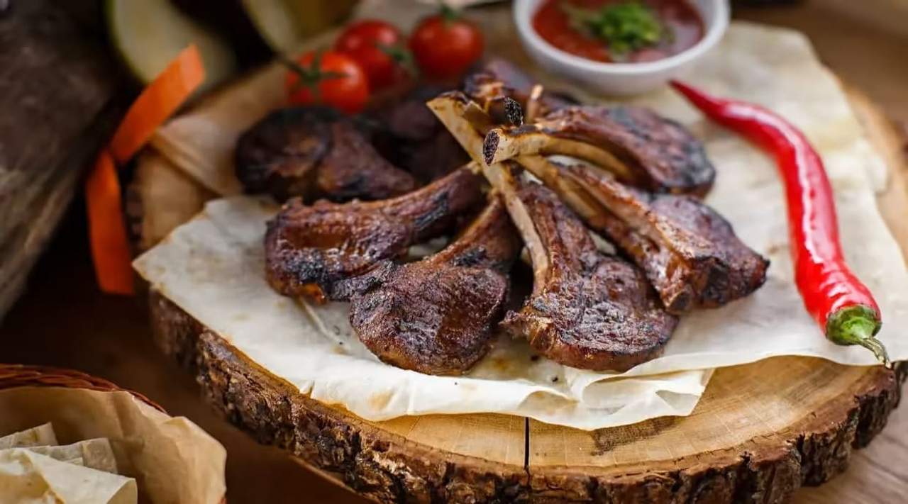 Суп харчо, люля-кебаб свино-яловичий, гарнір (може бути якась каша чи макарони), мариновані овочі , шотіс пури (грузинській хліб), компот з ягід.