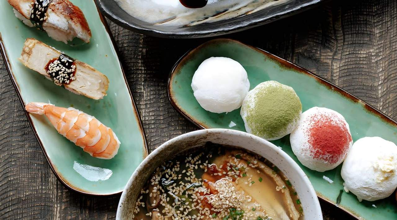 Японський десерт з рисового тіста з начинкою на основі крем сиру та білого шоколаду із матчею та кокосовим сиропом