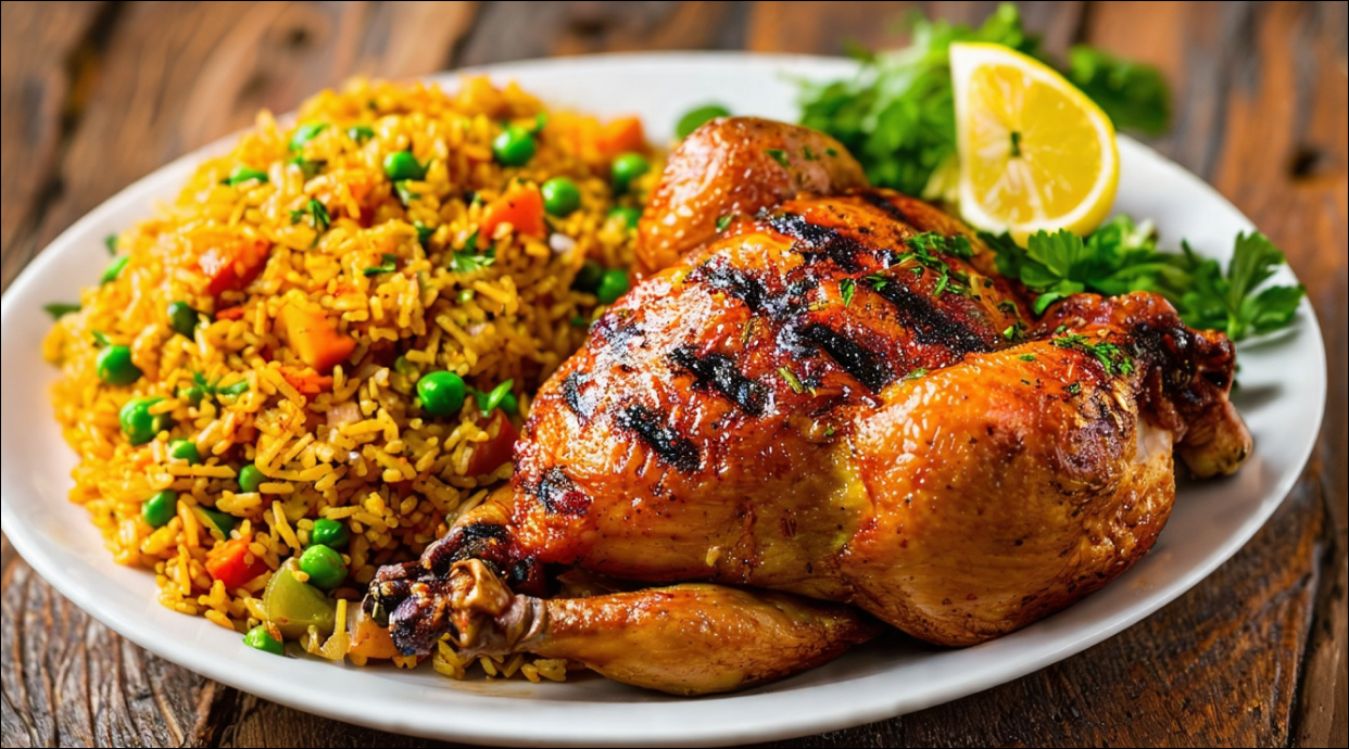 Traditional charcoal roasted chicken with natural spices served with your choice if accompaniment.