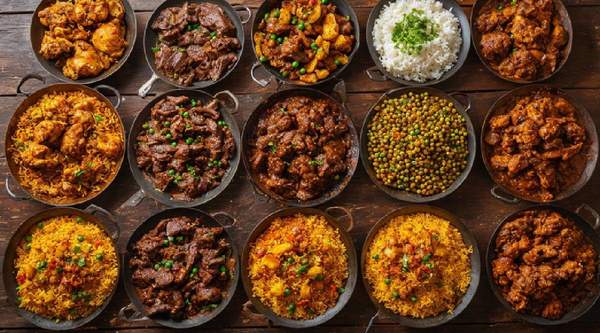 Goat stew cooked with matooke, rice, chapati and greens for a rich, filling meal.