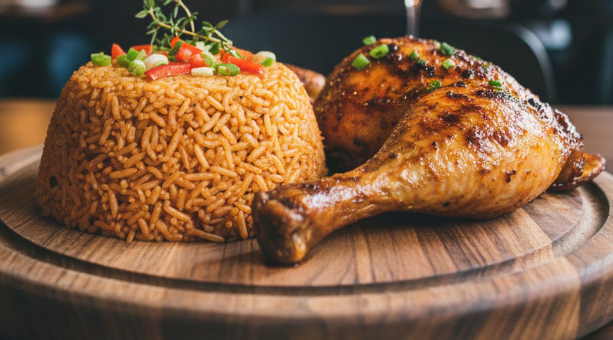 Flavorful pilao rice served with seasoned chicken