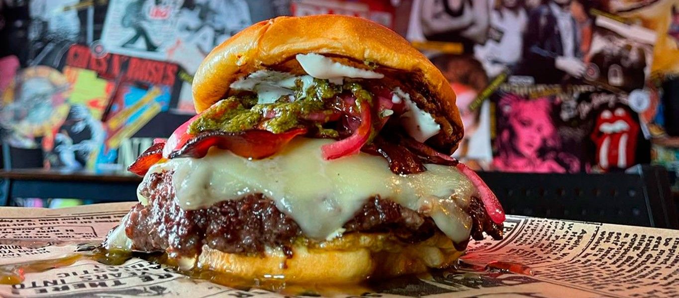 180gr de carne madurada 30 días doble smashed, salsa ranchera, chimichurri y cebolla encurtida. acompañada con patatas fritas