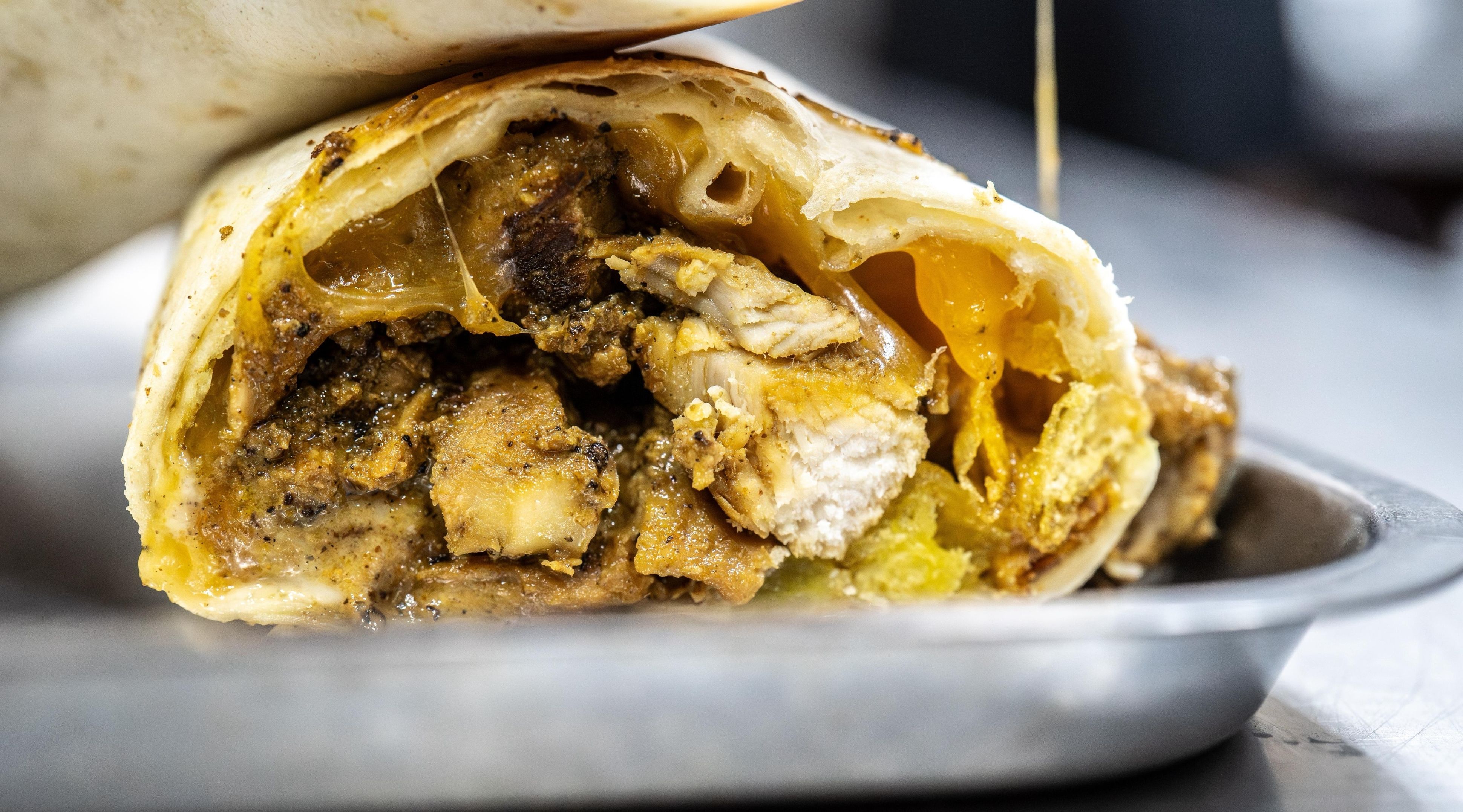 Pollo especiado, pepinillos, salsa de ajo, melaza de granada, queso y patatas fritas dentro del wrap.