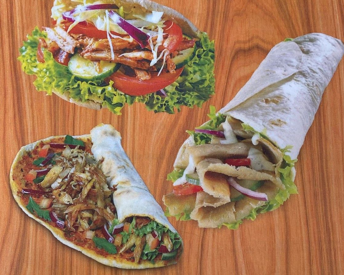 Tiras de carne de ternera, pollo, mixto o falafel, con ensalada, arroz, pan y salsas de la casa. Con patatas y bebida