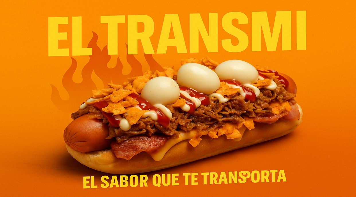Salchicha, salsas, queso fundido, ripio de papitas, huevo de codorniz.
