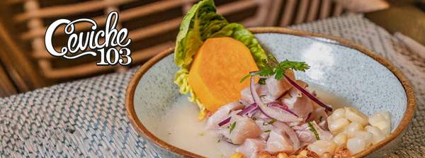 Con leche de tigre picante, boniato, maíz chulpi, choclo y chicharrón de pota.