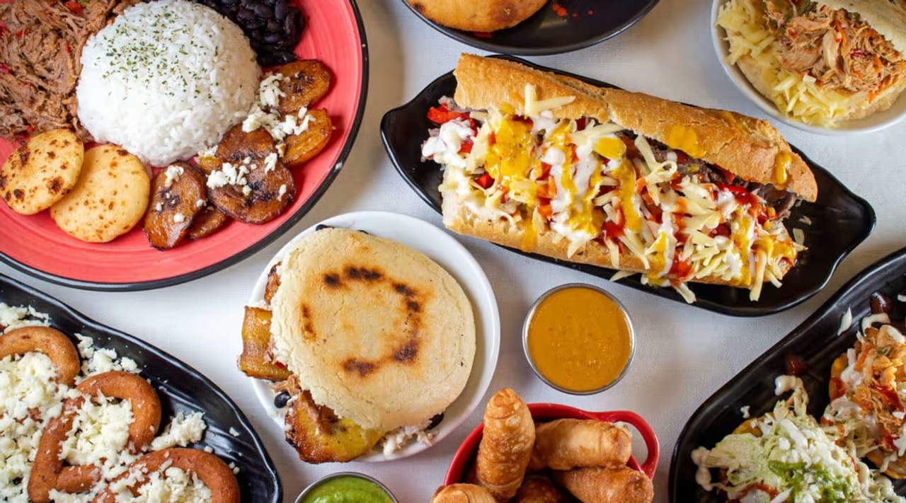 Contiene arroz, alubias negras, carne mechada de ternera, tajadas de plátano maduro, queso blanco latino rallado y 1 una mini arepita.