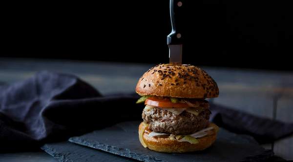 Pan potato rolls, 3 hamburguesas de raza marela (500 gr). Bacon, queso Cheddar y Gorgonzola, rúcula, pomodoro, uovo strapazzato, baconaise i salsa BBQ Bull's Eye Original.
