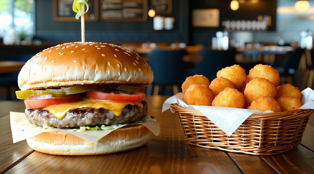 Hamburguesa casera de ternera, tomate, cebolla cocida y salsa de roquefort. Servida con patatas fritas