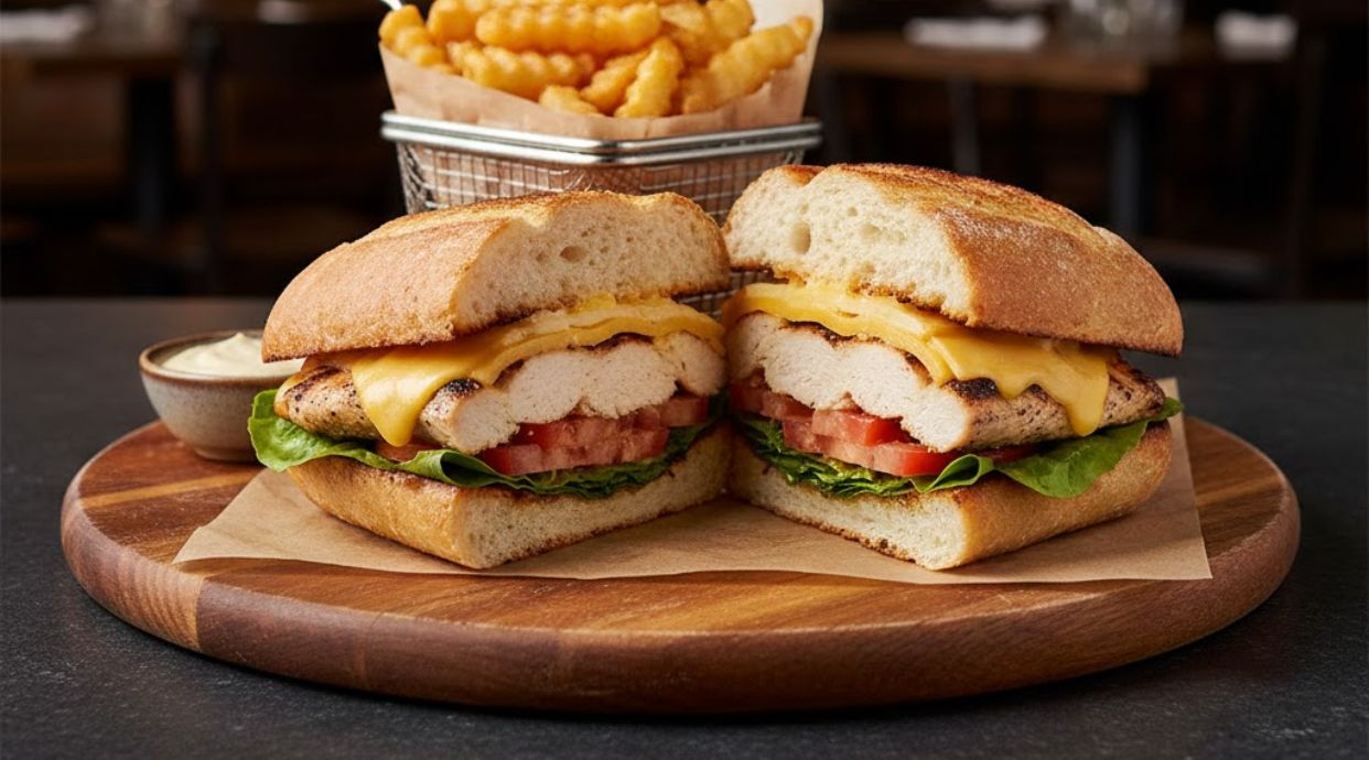 Pechuga de pollo a la plancha con lechuga fresca, tomate natural y queso fundido en pan artesanal