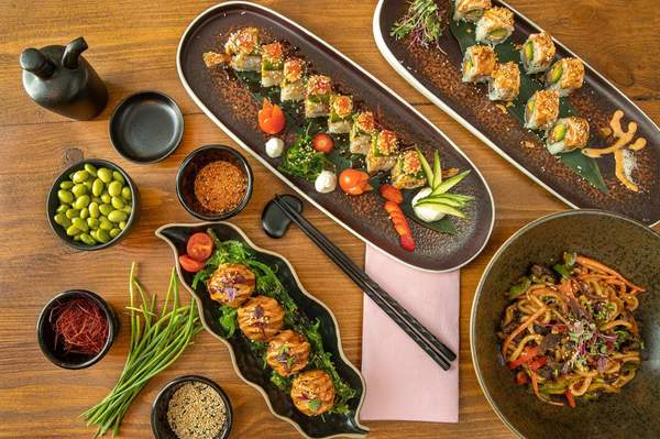 Base de arroz de sushi, aguacate, maíz dulce, zanahoria, edamames y col lombarda