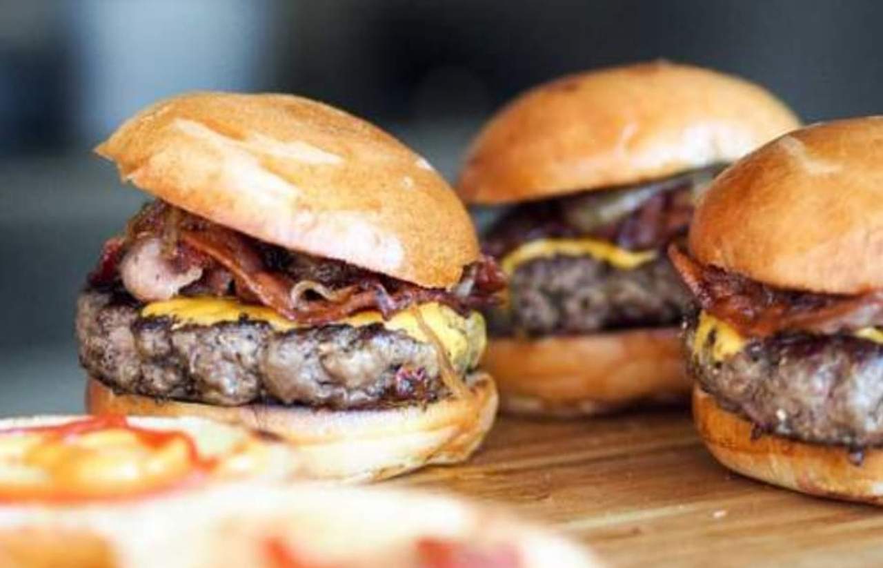 Doble carne, escarola, tomate, doble de queso, bacón, cebolla y tres salsas.