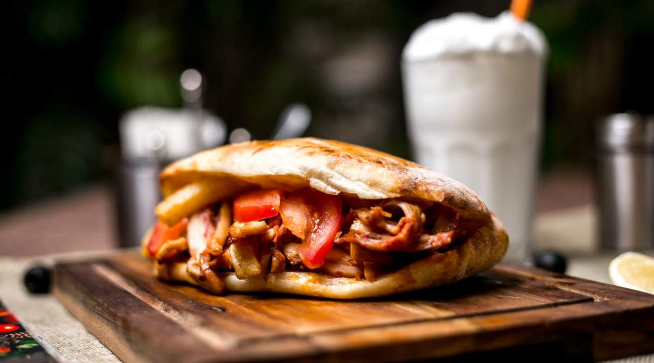 Carne de ternera o pollo con lechuga, tomate, cebolla, nuestra salsa de yogur, tomate, se sirve en plato y con pan