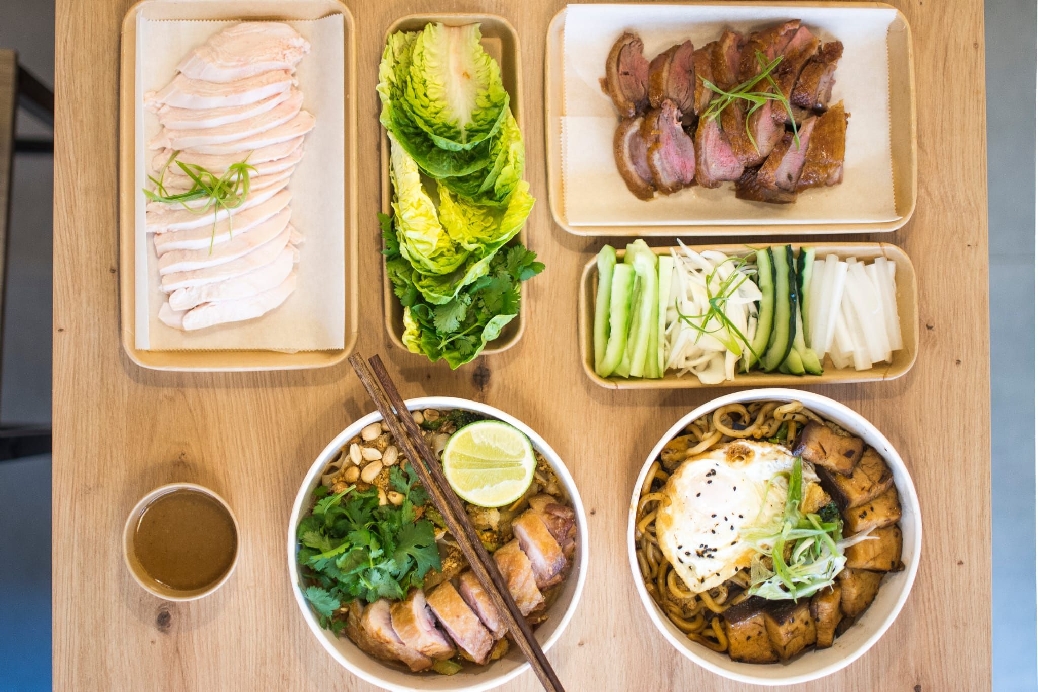 Medio pato asado al horno "À la minute" por cada pedido, con una base, salsa, pack de verduras (nabo encurtido en vinagre de arroz, pepino en salmuera, cebolleta fresca y pepino fresco sin piel) y un wok o sopa de huesos de pato.