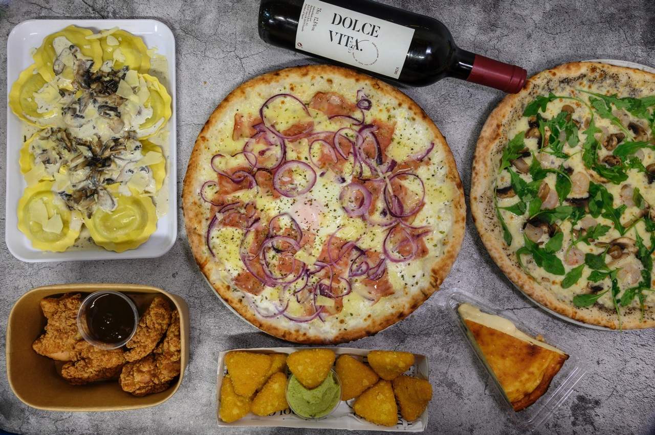 Tomate, mozzarella, atún, gambas, champiñones, olivas negras y huevo
