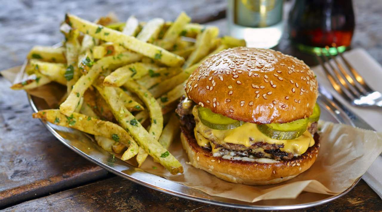 Salsa de vino tinto,mezclum, carne de potro 200 gr. queso, cebolla caramelizada, bacón, tomate beef y patatas fritas, con pan de cereales