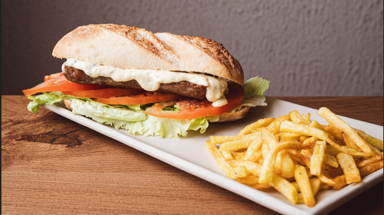 Chorizo criollo casero, con lechuga, tomate, mayonesa de chimichurri y un toque de patatas fritas