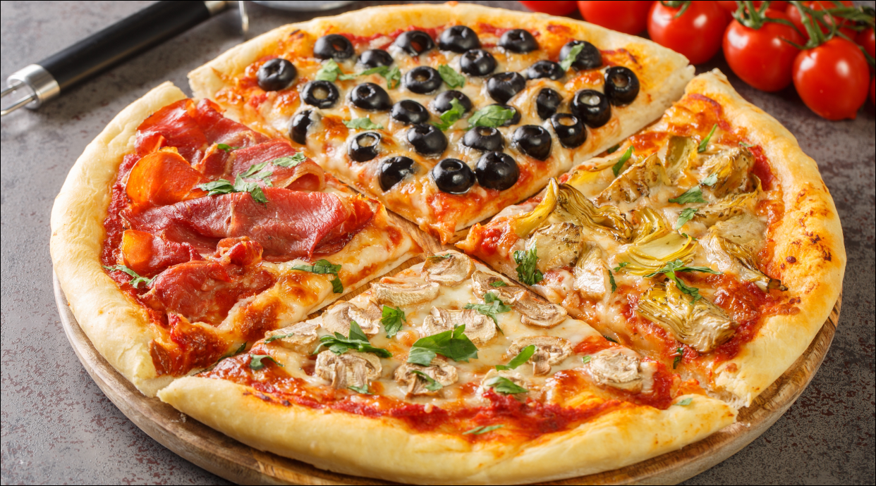 Tomate, mozzarella, champiñones, jamón York, atún y pepperoni