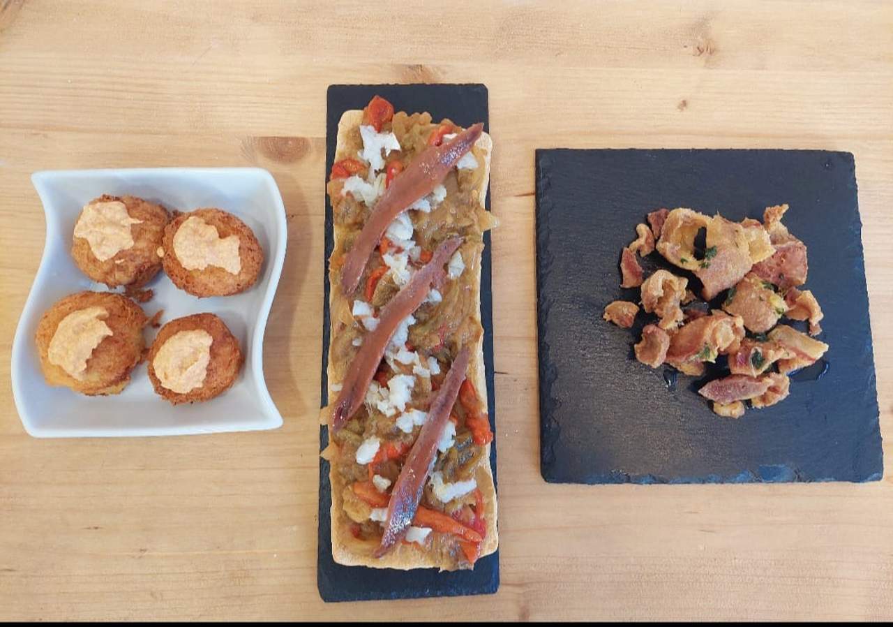 Torrada de escalivada con virutas de bacalao y anchoas del cantábrico