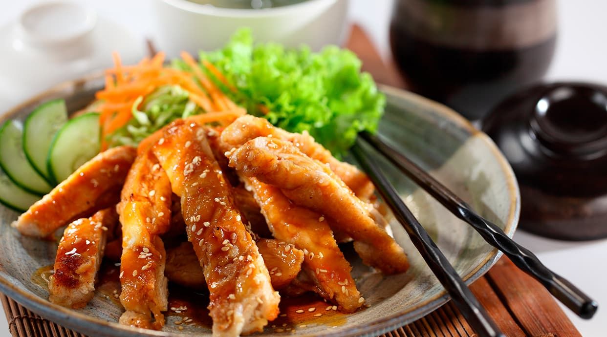Maki con anguila. queso. aguacate. esparrago. masogo, en tempura y salsa picante.