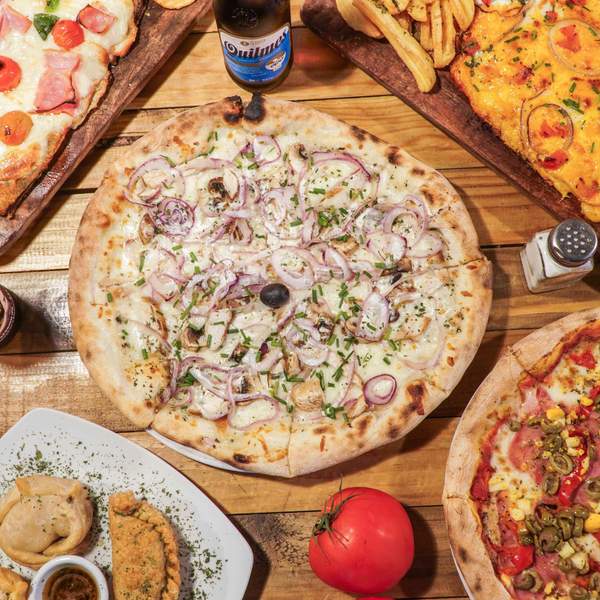 Tomate, mozzarella, tomate natural, cebolla, bacon, parmesano, pimentón picante