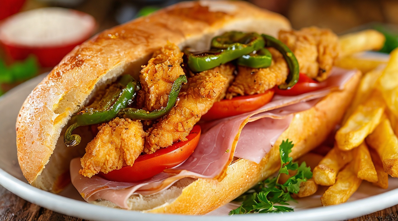 Filetes de pollo empanado, jamón serrano, tomate y pimiento frito. Acompañado de patatas fritas
